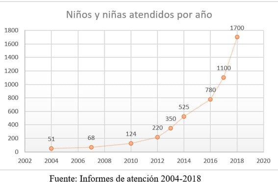 La Fundadora Esperanza Triana y su colaboradoras lograron realizar una excelente gestión administrativa entre los recursos públicos y privados, lo cual permitió que progresivamente fueran incrementando el número de unidades de atención contratadas con el Instituto Colombiano de Bienestar Familiar para su Programa de atención Integral, manteniendo ininterrumpida la contratación entre los años 2004-2018, finalizando con 118 unidades de atención para un total de 1700 niños y niñas de Primera Infancia que recibían atención integral. Lo cual logra reflejarse en la gráfica.